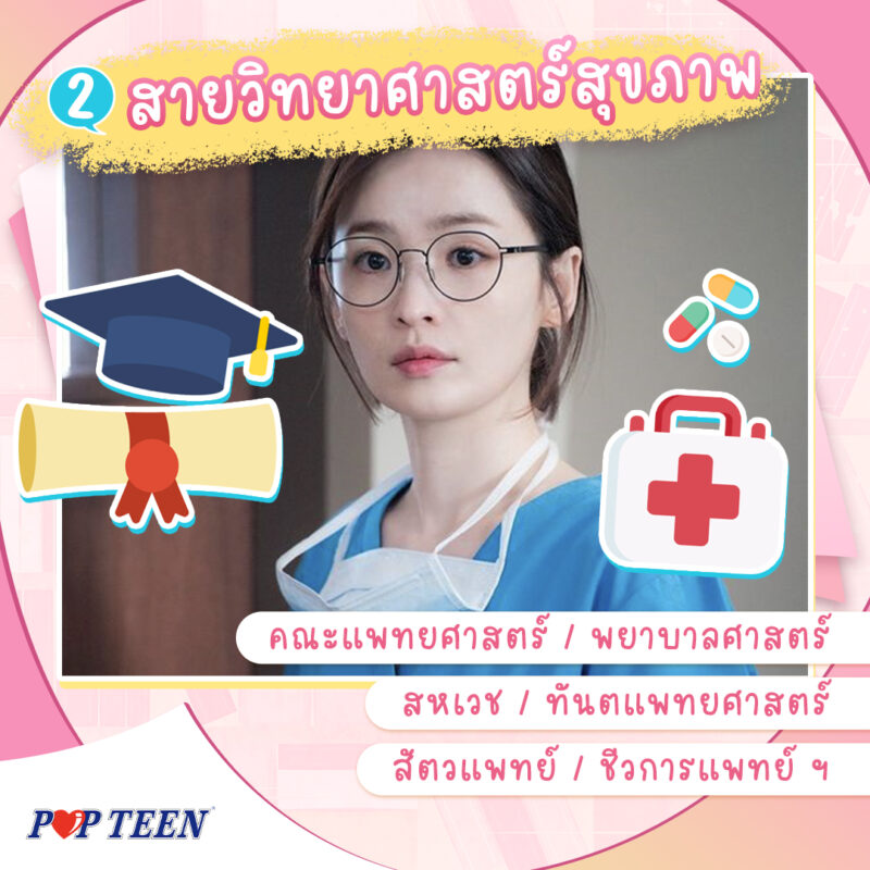 สายนี้มีความต้องการของตลาดงานทั่วโลกสูงมาก ยิ่งเป็นวิทยาศาสตร์สุขภาพ ยิ่งมีคนให้ความสำคัญมากขึ้น เพราะเป็นสายอาชีพที่เรียนยากและเป็นหลักสูตรเฉพาะทาง เรียนจบมามีอาชีพรองรับแน่นอนค่ะ คณะส่วนใหญ่ก็มี คณะแพทย์ศาสตร์ พยาบาลศาสตร์ สหเวช ทันตแพทยศาสตร์ สัตวแพทย์ ชีวการแพทย์ ฯ เป็นต้นค่ะ