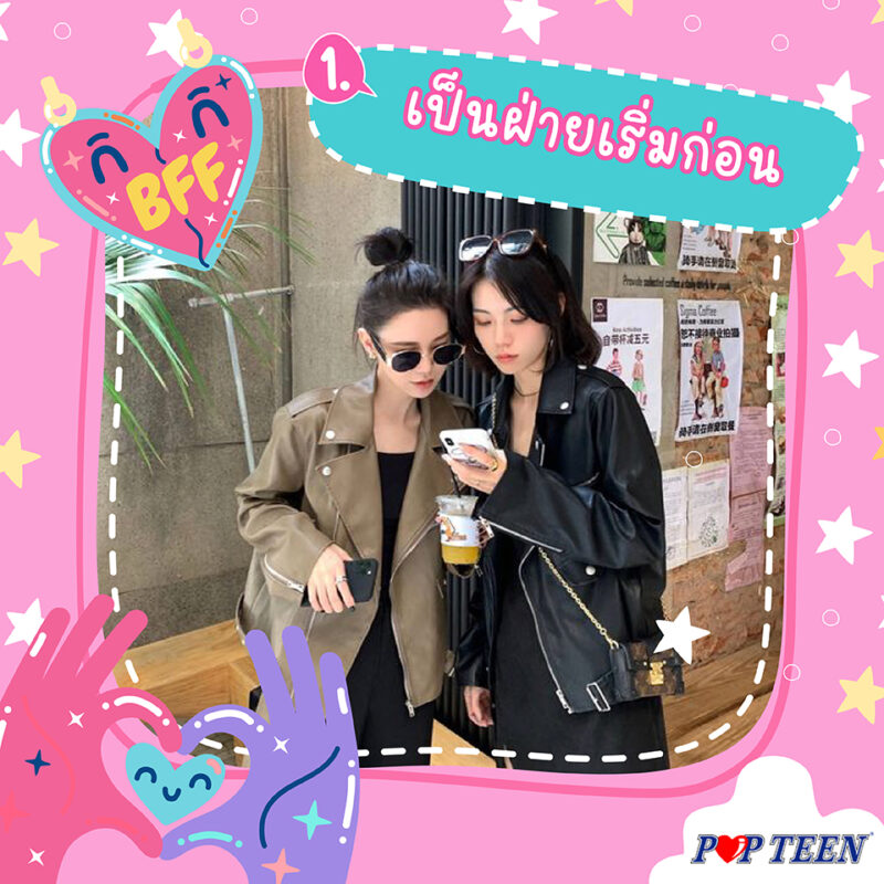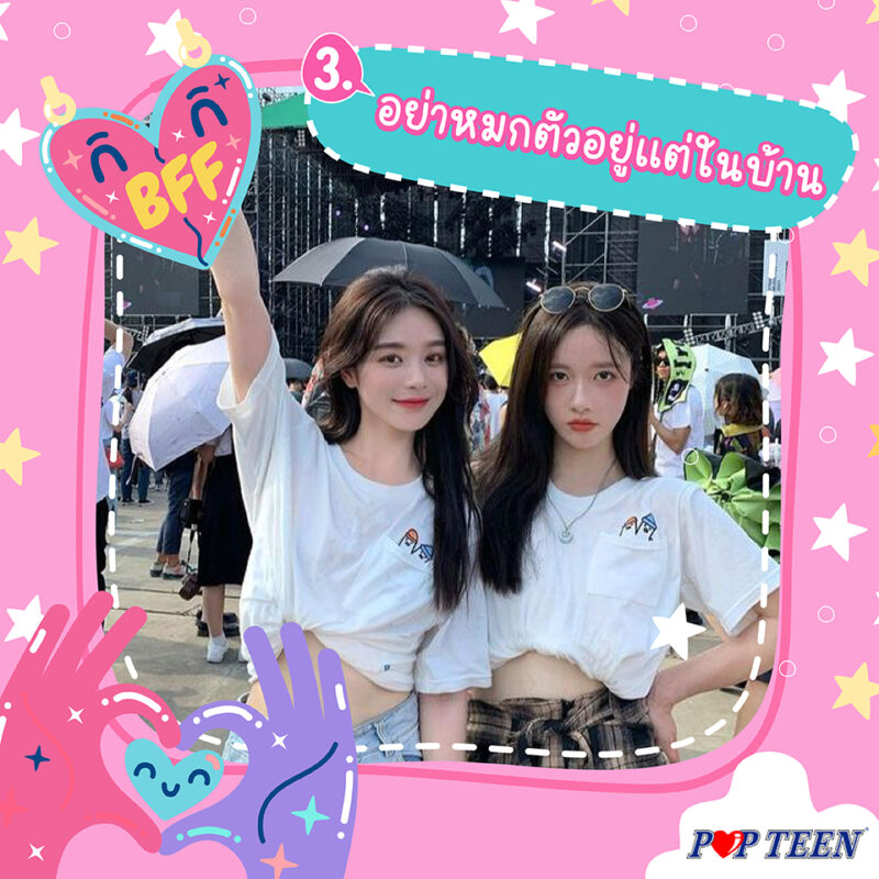 หากอยากทำความรู้จักเพื่อนใหม่ๆ ก็ต้องออกจากบ้านบ้างค่ะ เพื่อนชวนไปไหนก็ตอบโอเค หรือออกไปเองคนเดียวบ้าง หรือจะลองไปเข้ากิจกรรมต่างๆ ก็ได้ เราอาจได้เจอเพื่อนใหม่ที่สนใจอะไรเหมือนๆ กันด้วยนะ
