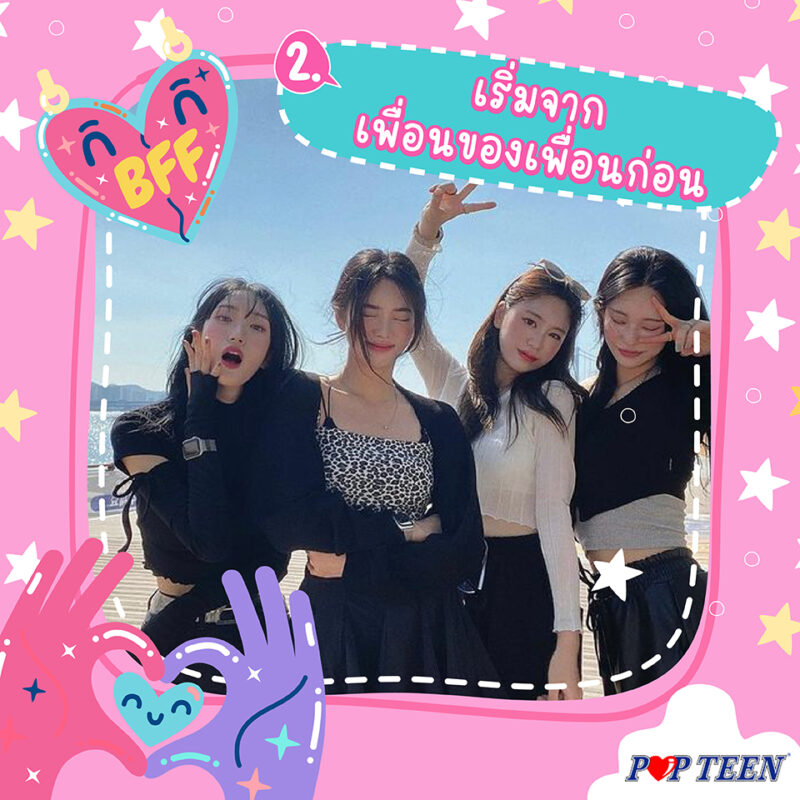 อาจเริ่มจากการเข้าหาเพื่อนของเพื่อนเราก็ได้ เป็นสายที่ไม่ไกลกันมาก คุ้นหน้าคุ้นตา เราอาจมีข้อมูลเขาอยู่บ้างจากเพื่อนเรา และอาจต้องเจอกันอีกเรื่อยๆ ก็ถือว่าได้เพื่อนใหม่เพิ่มแล้ว