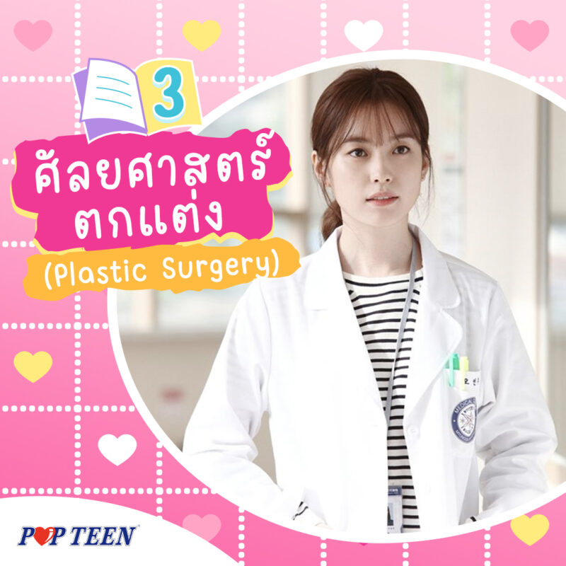 หรืออีกชื่อ “ศัลยแพทย์ตกแต่งและเสริมสร้าง” ซึ่งก็ฮอตมากๆ ในปัจจุบัน เพราะคนเดี๋ยวนี้ก็เริ่มกล้าทำศัลยกรรมกันมากยิ่งขึ้น ซึ่งแพทย์ด้านศัลยกรรมตกแต่งจะศึกษาในเรื่องความผิดปกติของรูปร่าง ผิวหนัง รวมทั้งระบบกล้ามเนื้อและโครงร่างของร่างกายด้วย