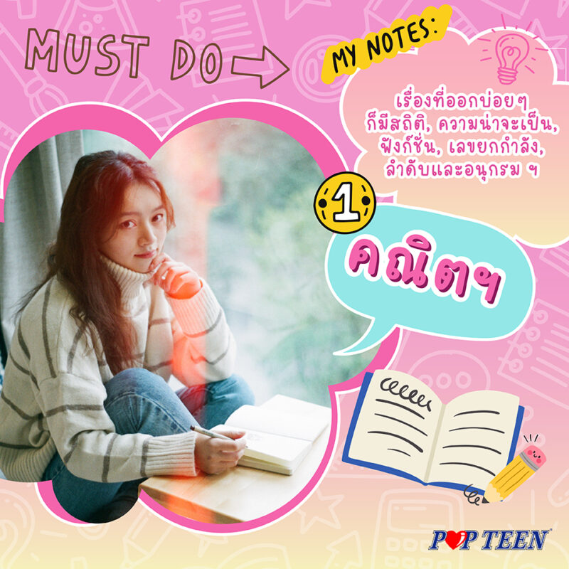 วิชาที่เต็มไปด้วยเลขและสูตร อย่างแรกต้องแม่นและเข้าใจสูตรแบบไม่ใช่แค่ท่องจำ จากนั้นเริ่มตะลุยทำโจทย์แบบจับเวลาด้วยนะคะ ซึ่งเรื่องที่ออกบ่อยๆ ก็มีสถิติ, ความน่าจะเป็น, ฟังก์ชั่น, เลขยกกำลัง, ลำดับและอนุกรม ฯ ค่ะ