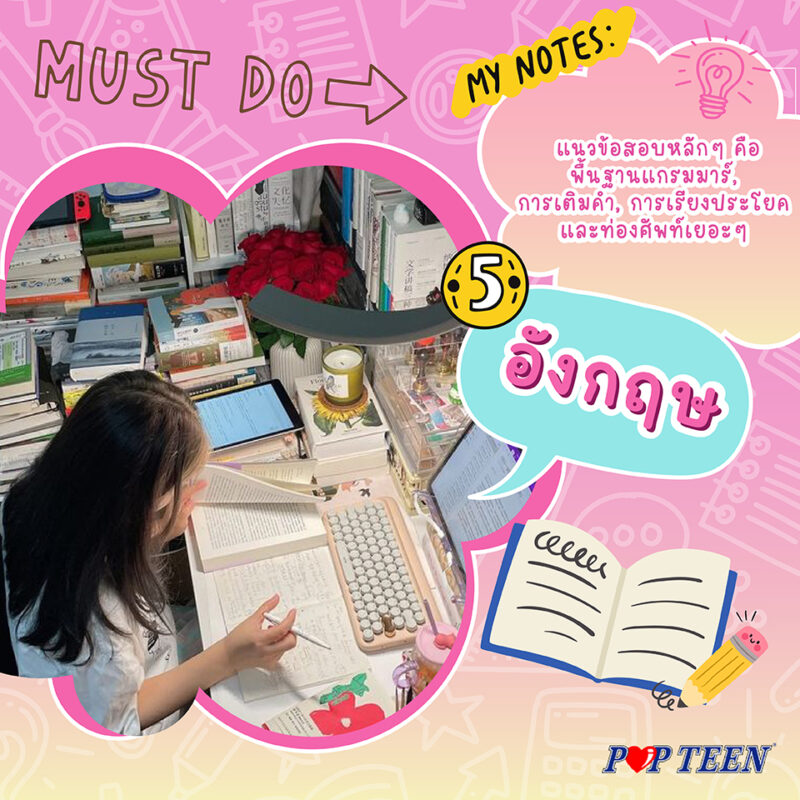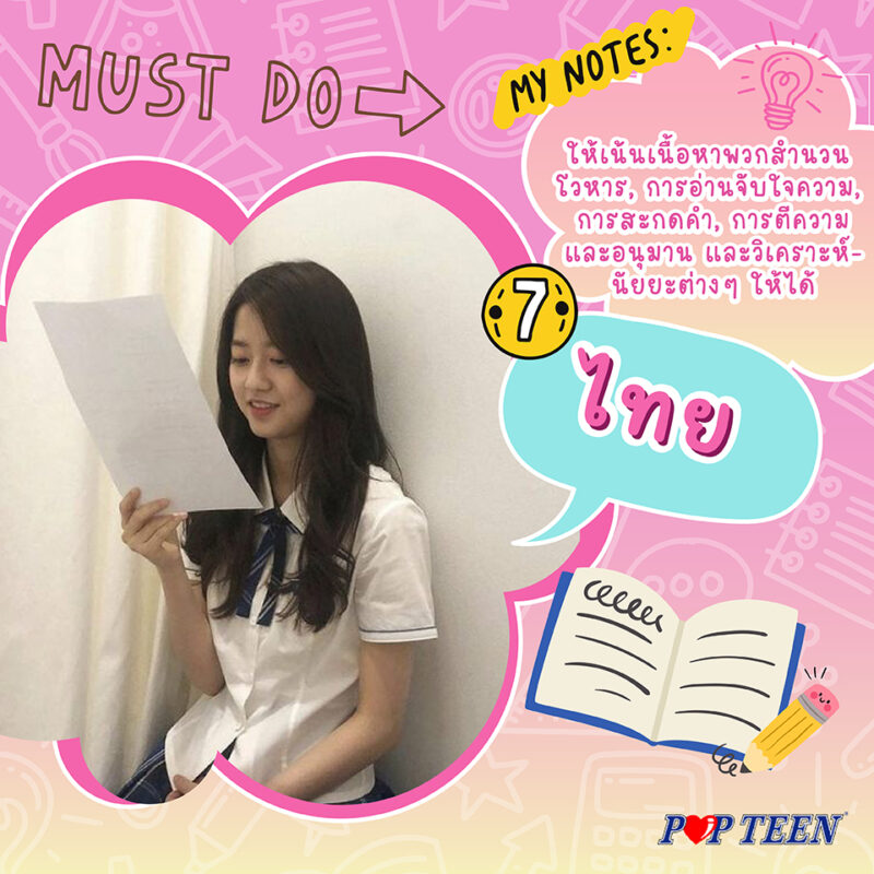 ภาษาประจำตัวที่หลายคนยังเขียนผิดใช้ผิดอยู่ ถ้าอยากได้คะแนนวิชานี้มาช่วยให้อุ่นใจ ให้เน้นเนื้อหาพวกสำนวน โวหาร, การอ่านจับใจความ, การสะกดคำ, การตีความและอนุมาน และวิเคราะห์นัยยะต่างๆ ให้ได้ เวลาทำอ่านโจทย์ให้ดีค่ะ