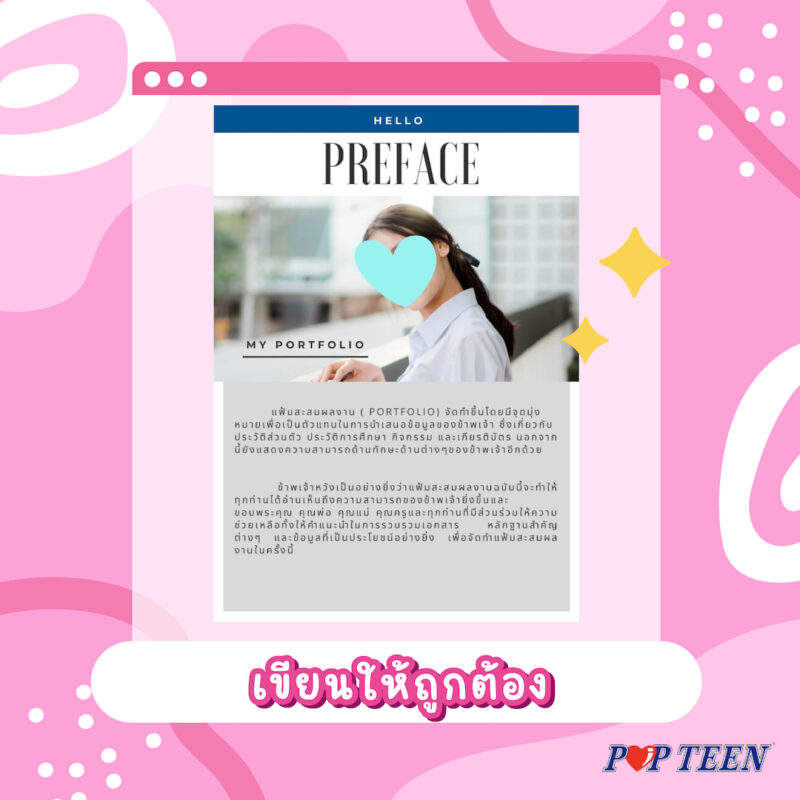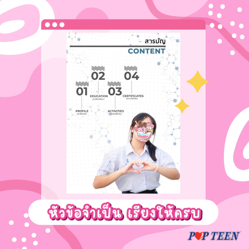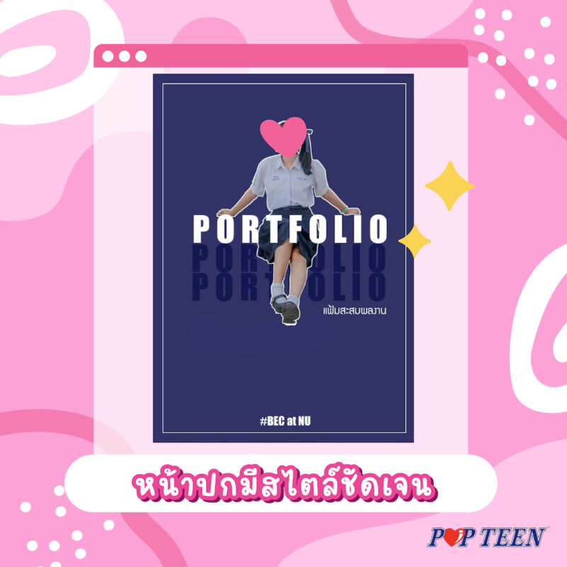 เพราะหน้าปกคือความทับจิตทับใจแรกที่จะทำให้กรรมการเห็นแล้วอยากหยิบขึ้นมาเปิด ดังนั้น เราควรครีเอตให้โดดเด่น สะดุดตา มีความเป็นตัวเรา สื่อถึงคณะ/สาขาที่ต้องการเข้า และอยู่ในขอบเขตที่พอดีและไปในทางสร้างสรรค์นะ