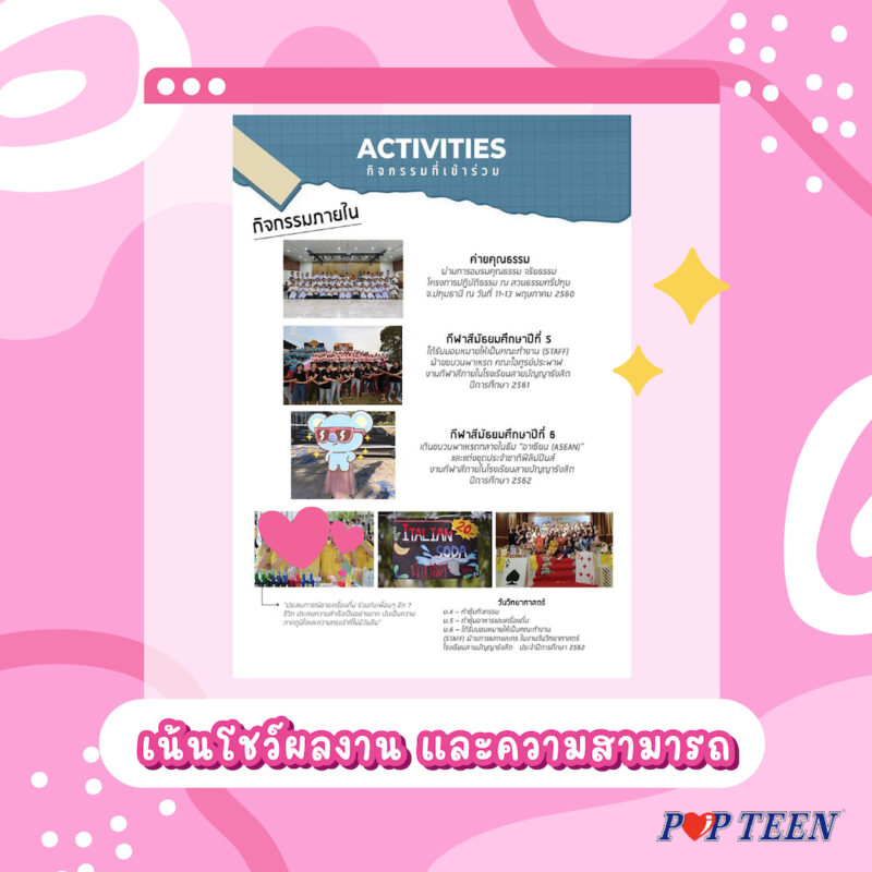 มีของดีต้องโชว์ค่ะ ไม่ว่าจะเป็นกิจกรรมที่เคยไป ผลงานที่เคยทำ ถ้ามีรางวัลการันตีก็แปะไปเลยค่า เน้นย้ำว่าให้ใส่เฉพาะผลงาน ความสามารถ และกิจกรรมที่ตรงกับคณะ/สาขาที่เราไปยื่นก็พอค่า