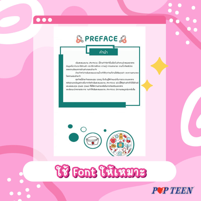 ถ้าคณะ/สาขาที่เราไปยื่นค่อนข้างมีความวิชาการ ก็ไม่ควรใช้ฟอนต์ที่ดีไซน์เยอะ และอย่าใช้ฟอนต์เกิน 2 – 3 รูปแบบค่ะ เพื่อความเป็นระเบียบเรียบร้อย อ่านสมูธ เช่น หัวข้อใหญ่ก็แบบนึง หัวข้อรองก็แบบนึง เนื้อหาก็แบบนึงค่ะ