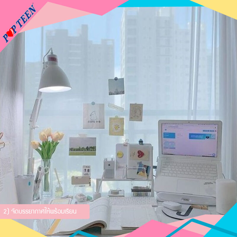 จากนั้นให้สร้างบรรยากาศให้พร้อมเรียน จัดโต๊ะ เก้าอี้ จัดโซนนั่งเรียนแยกจากเตียงนอน โต๊ะเรียนต้องมีไฟสว่าง อากาศถ่ายเท อาจหาเทียนมาจุด หากลิ่นที่ช่วยกระตุ้นให้แอคทีฟ และอย่าลืมหาน้ำมาวางไว้ใกล้ๆ จะได้ไม่ต้องเดินไปหยิบให้เสียสมาธิค่ะ