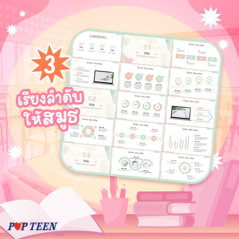 นอกจากใส่ตัวหนังสือในสไลด์น้อยๆ แล้ว เราควรจัดเรียงเนื้อหาในแต่ละสไลด์ให้ดูเป็นเรื่องราวตามลำดับด้วยค่ะ อย่าสลับไปมา เพราะคนฟังจะงง คนพรีเซนต์ก็จะงงเองไปอีกด้วย