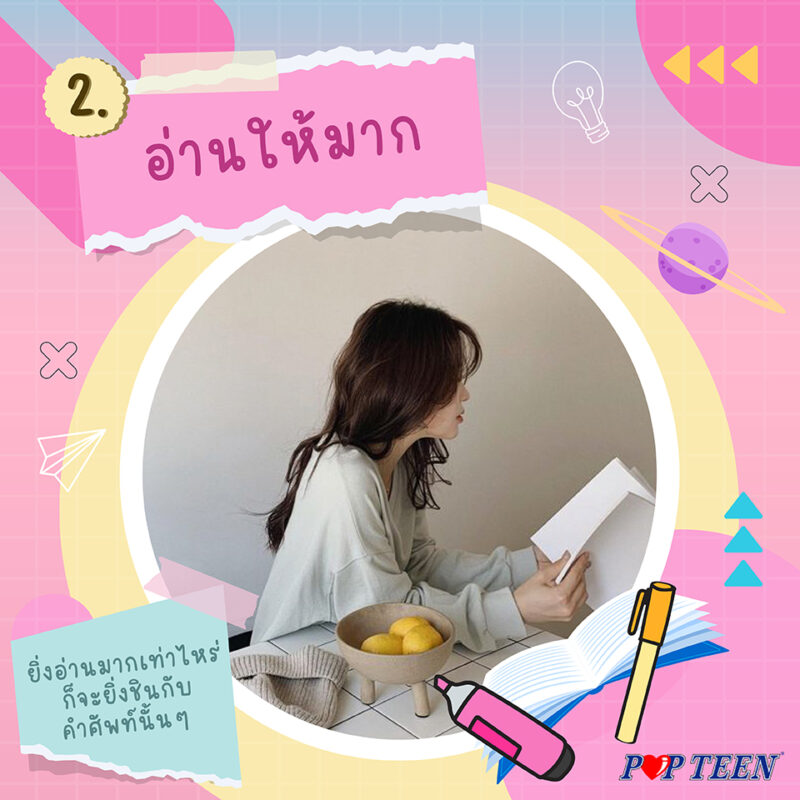 การอ่านจะทำให้เราเจอคำศัพท์ใหม่ๆ เยอะ เราอาจพกหนังสือภาษาอังกฤษติดตัว ยิ่งอ่านมากเท่าไหร่ก็จะยิ่งชินกับคำศัพท์นั้นๆ อย่าลืมวงศัพท์ที่ไม่รู้แล้วหาความหมาย หรือจะใช้วิธีเดาความหมายจากบริบทที่เกี่ยวข้องก็ได้ค่ะ