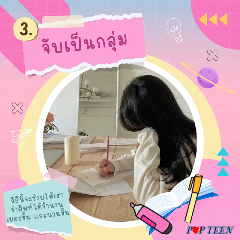 การจำศัพท์เป็นกลุ่มๆ ก็ช่วยให้จำแม่นได้นะ อาจจำเป็นกลุ่มคำที่มีความหมายเดียวกัน หรือจำรากศัพท์ของคำนั้นๆ ก็ได้ เช่น Beautiful, Stunning, Gorgeous ที่แปลคล้ายกันว่าสวย ดูดี วิธีนี้จะช่วยให้เราจำศัพท์ได้จำนวนเยอะขึ้น และนานขึ้น