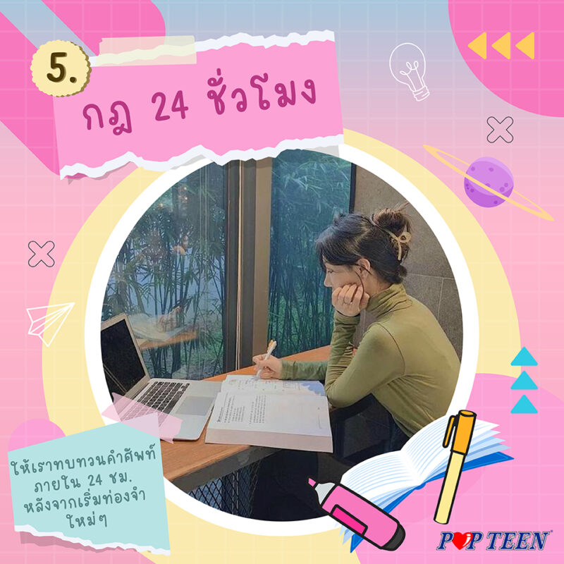 ให้เราทบทวนคำศัพท์ภายใน 24 ชั่วโมงหลังจากเริ่มท่องจำใหม่ๆ ค่ะ เพราะสมองของคนเราจะจดจำได้ดีในช่วง 24 ชั่วโมงแรกของการเจอสิ่งต่างๆ และถ้าเรานำไปใช้ต่อเนื่อง เราก็จะจดจำคำศัพท์นั้นได้แม่นยำสุดๆ ค่ะ