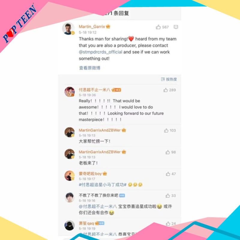 เห็นได้ชัดว่าไอดอลหนุ่มของเราคนนี้ต้องตื่นเต้นมากจริง ๆ แน่ ๆ (สังเกตจากอัศเจรีย์ที่ใส่ไป (*≧▽≦)ノ) ซึ่งหลังจากที่ทั้งสองสนทนากัน เหล่าแฟน ๆ ก็มาร่วมดันร่วมยินดีกันยกใหญ่ ซึ่งก็ไม่แปลกใจที่พ่อหนุ่ม Fu Sichao จะตื่นเต้นขนาดนี้หรอก ก็ดูผลงานของพี่ Martin Garrix แต่ละผลงานสิ อย่างเช่น