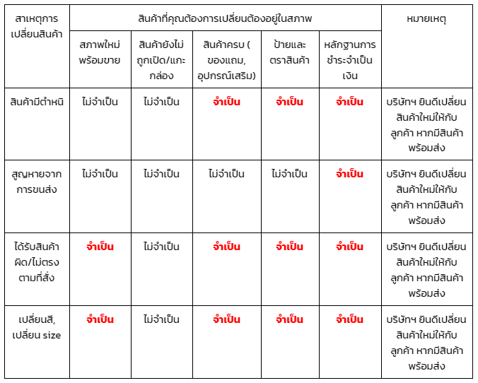 เงื่อนไขการเปลี่ยนสินค้า สินค้าและบรรจุภัณฑ์ต้องเป็นไปตามเงื่อนไขที่กำหนดด้านล่าง มิฉะนั้นบริษัทฯ ขอสงวนสิทธิ์ในการรับเปลี่ยนสินค้า