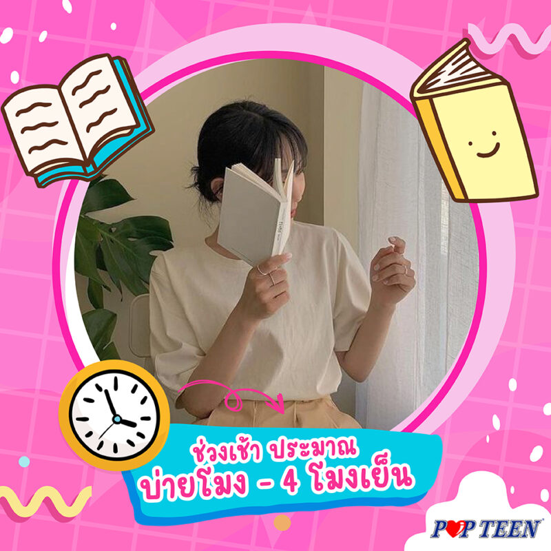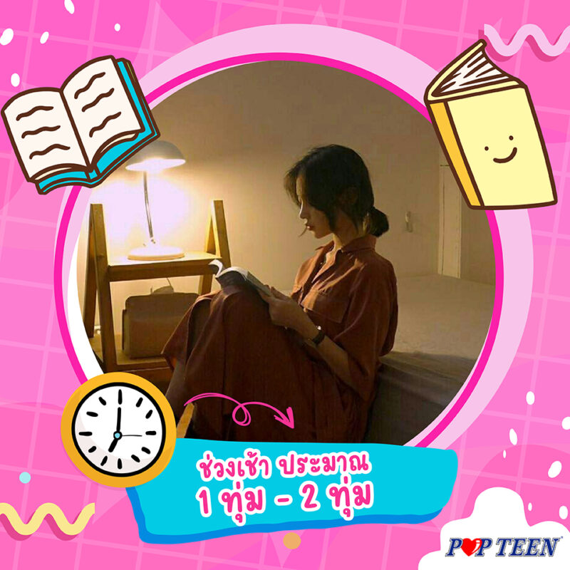 ช่วงเวลาที่อิงตามความวุ่นวายในชีวิตของแต่ละคน เพราะแต่ละคนก็อาจมีเวลา Golden Hour ไม่เหมือนกัน ดังนั้น เลือกช่วงที่ความคิดนิ่งๆ ไม่ฟุ้งซ่านกับเรื่องนู้นเรื่องนี้ นั่นคือช่วงที่ควรหยิบหนังสือมาอ่าน เพราะจะจดจำเนื้อหาได้ดีที่สุดค่ะ